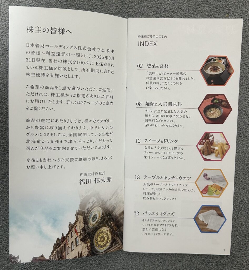 日本管財の株主優待は、全国の名産品や日用品などが掲載されたカタログギフトから好きな商品を選ぶ方式です。